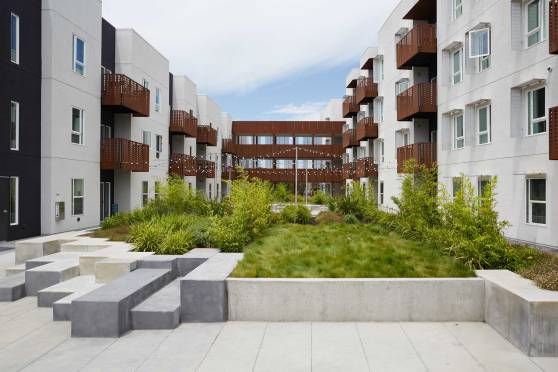 This infill development includes six residential buildings and a community center. Features include tuck-under garages, natural ventilation, preserved native trees, and community amenities such as gardens and a playground — combining sustainability with neighborhood integration.